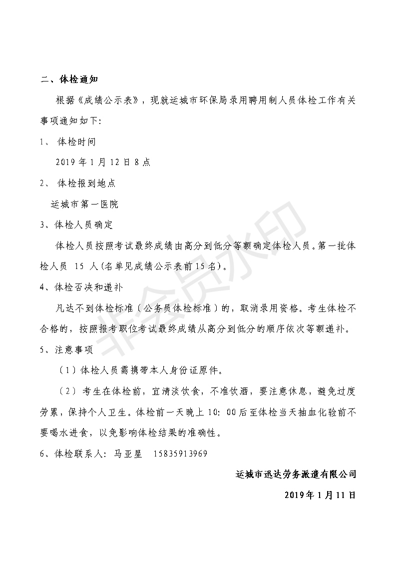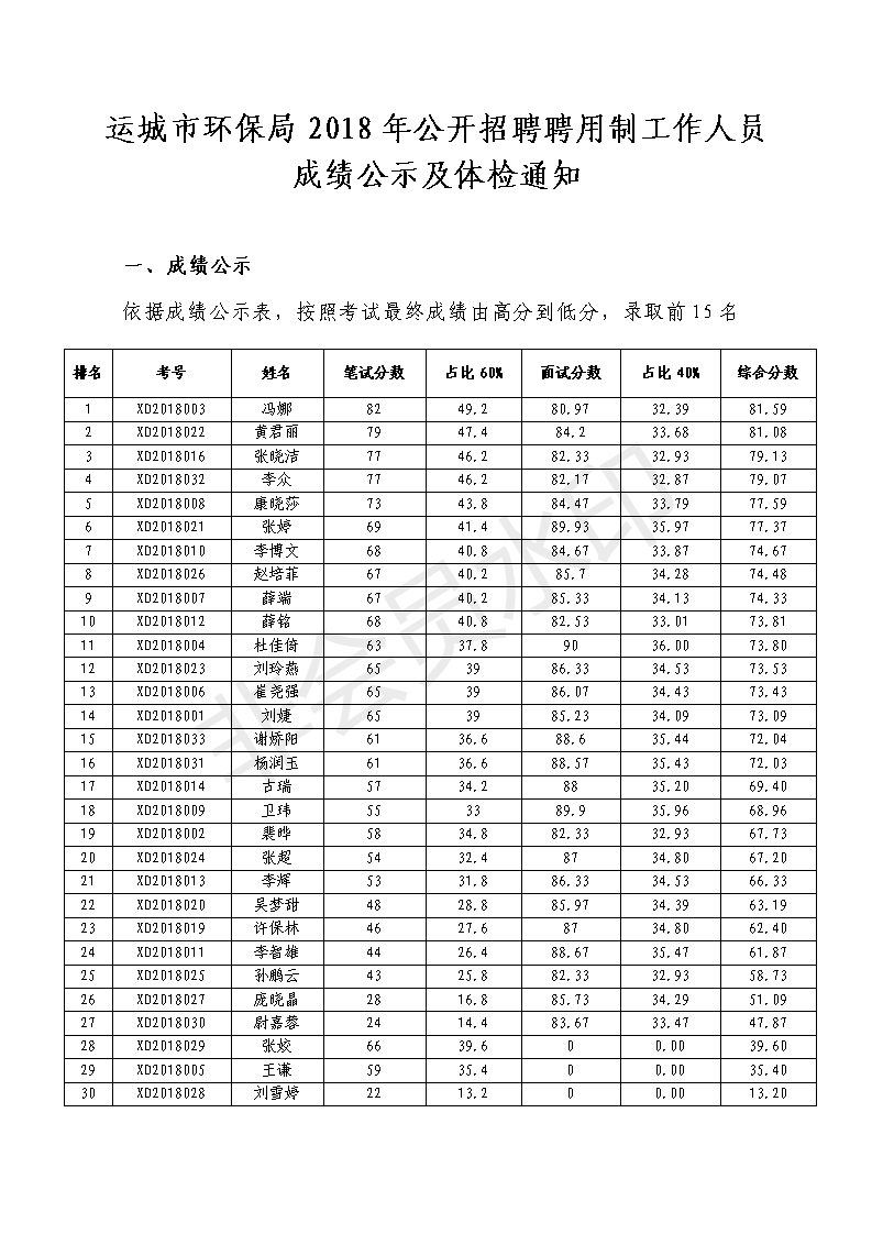 【公告】運城市環保局2018年公開招聘聘用制工作人員成績公示及體檢通知